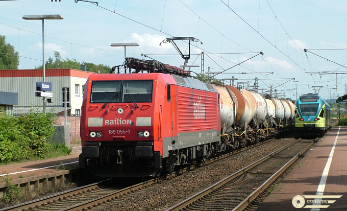 | 189 055 am 21.Juli 2009 durch Ibbenbüren - Im Hintergrund ET 006 auf dem Weg nach Bielefeld | |||